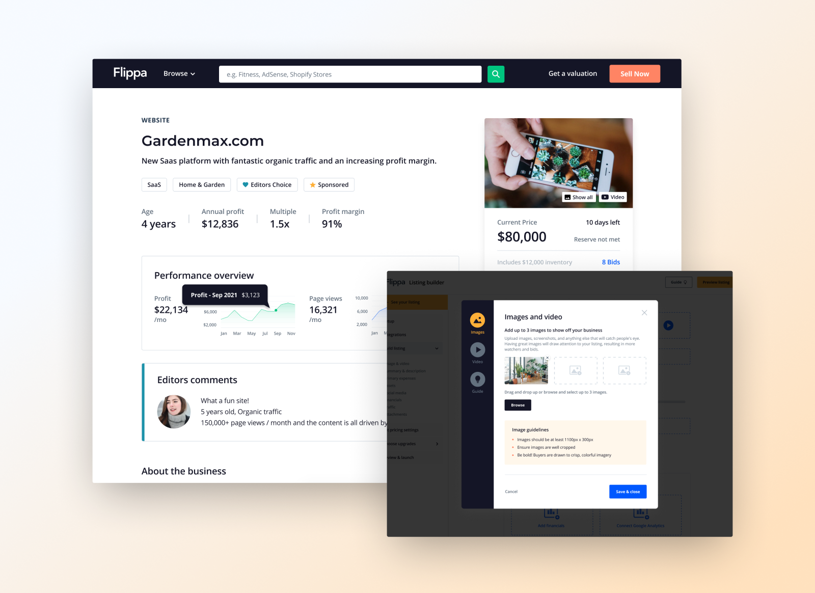 Flippa is the leading online marketplace for buying and selling websites, apps and any form of digital real estate. I lead the design for Flippa’s new Listing Builder product: a dynamic new way for sellers to create and launch a listing on the platform.