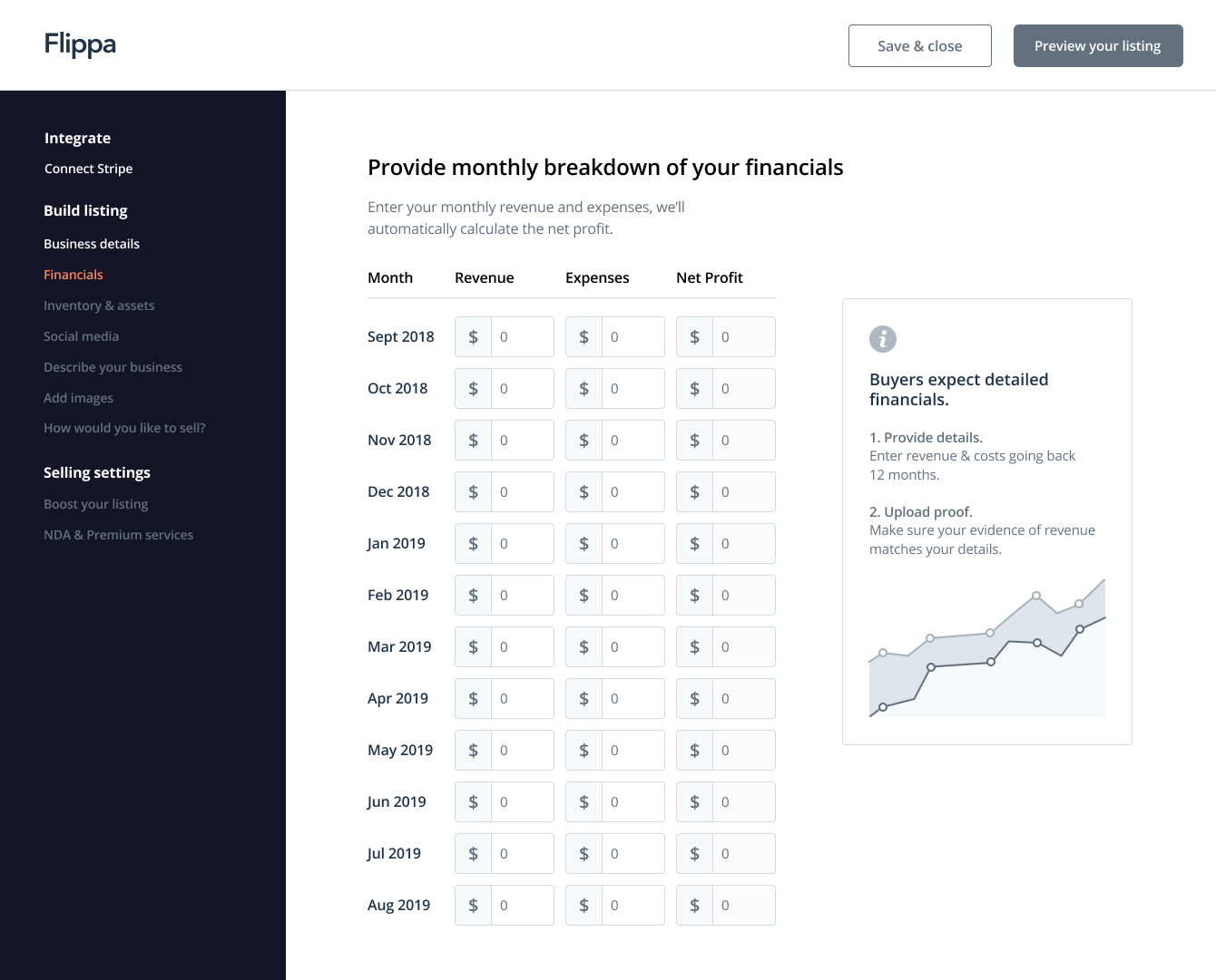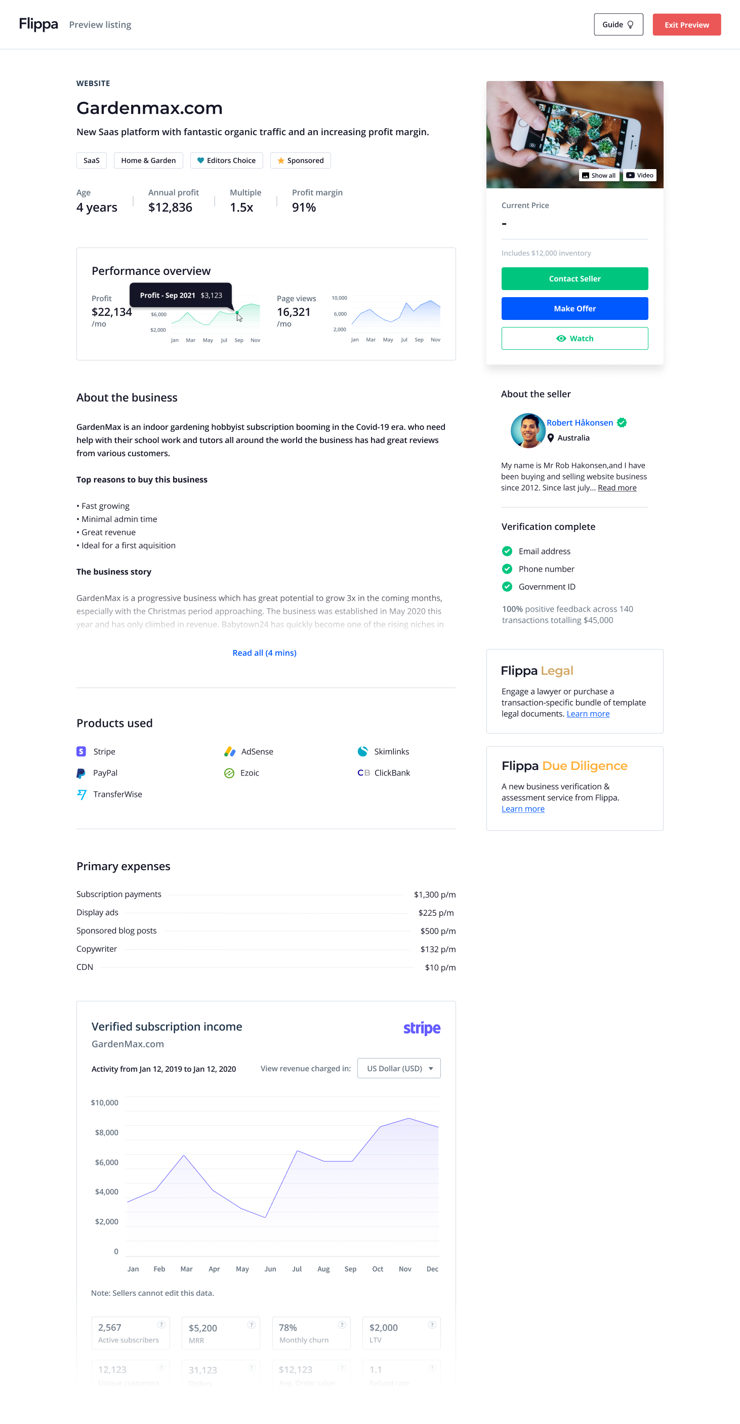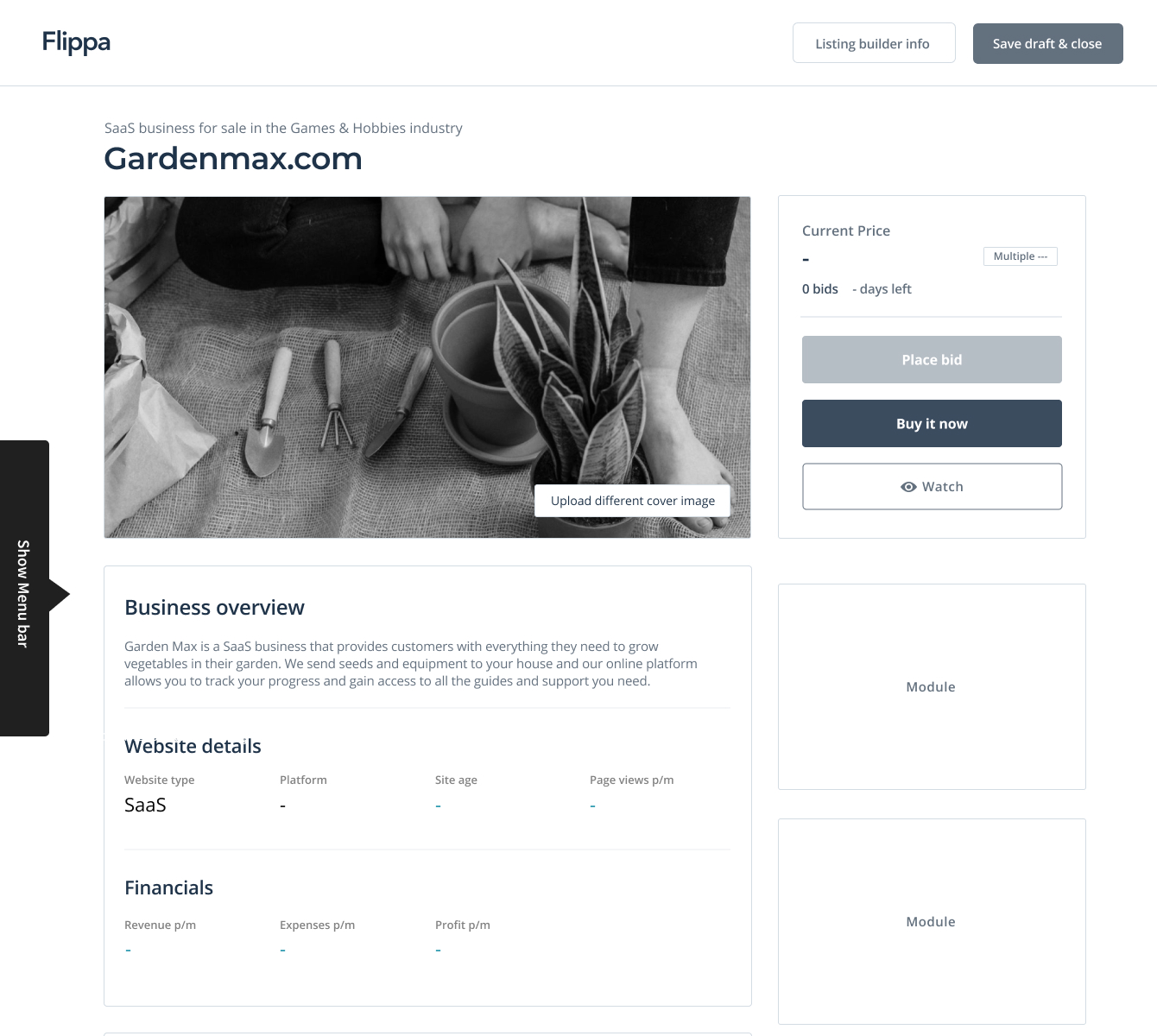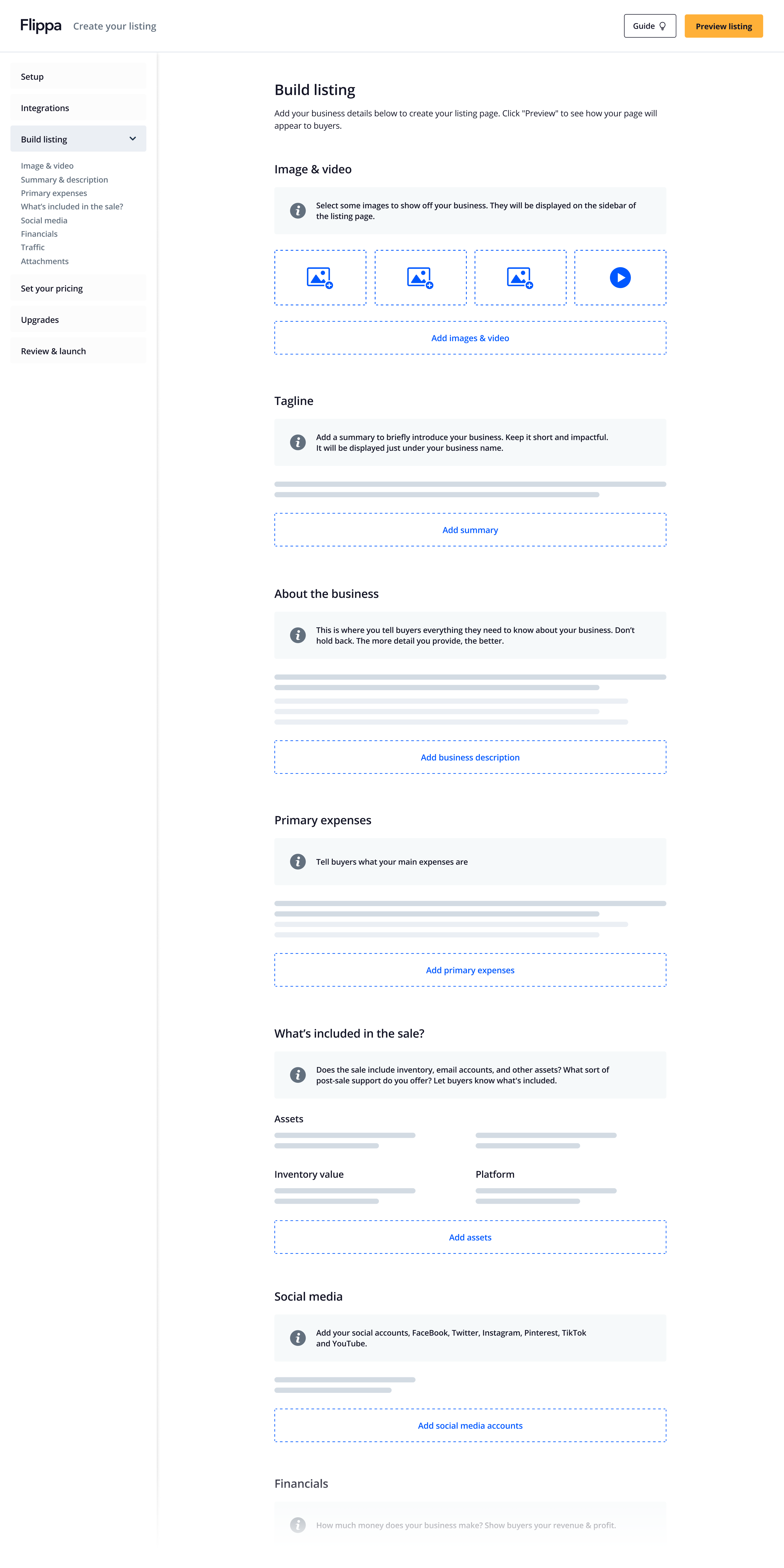 The Listing Builder is a freeform editor which allows sellers to create and launch a listing on Flippa exactly how buyers will see it. Sellers import verified data from any platform they use (e.g. Stripe, Shopify), then populate an empty listing page with their business information such as financials, traffic, social media accounts, platform data and more. Sellers then set parameters such as pricing and auction settings before launching their listing on the marketplace.