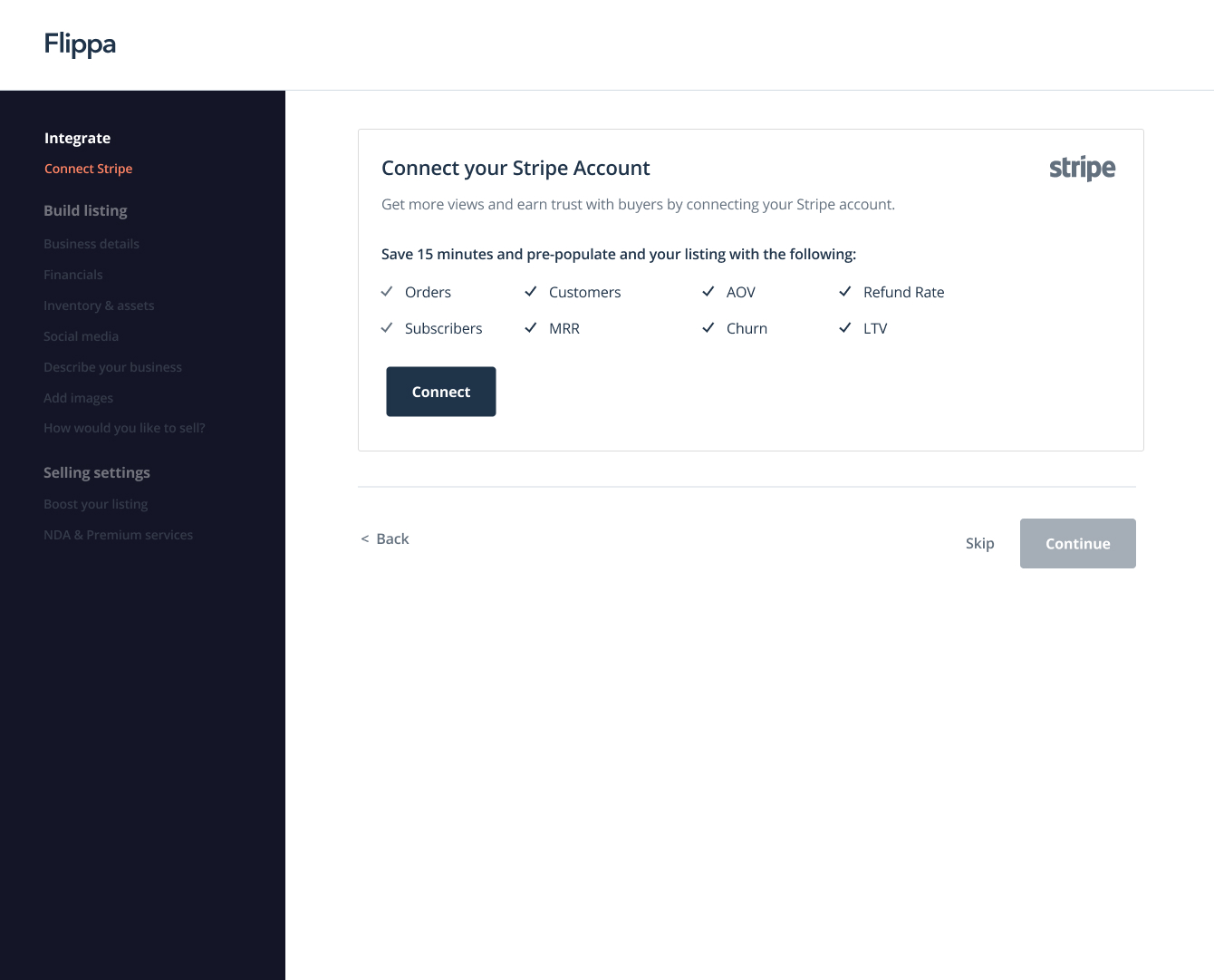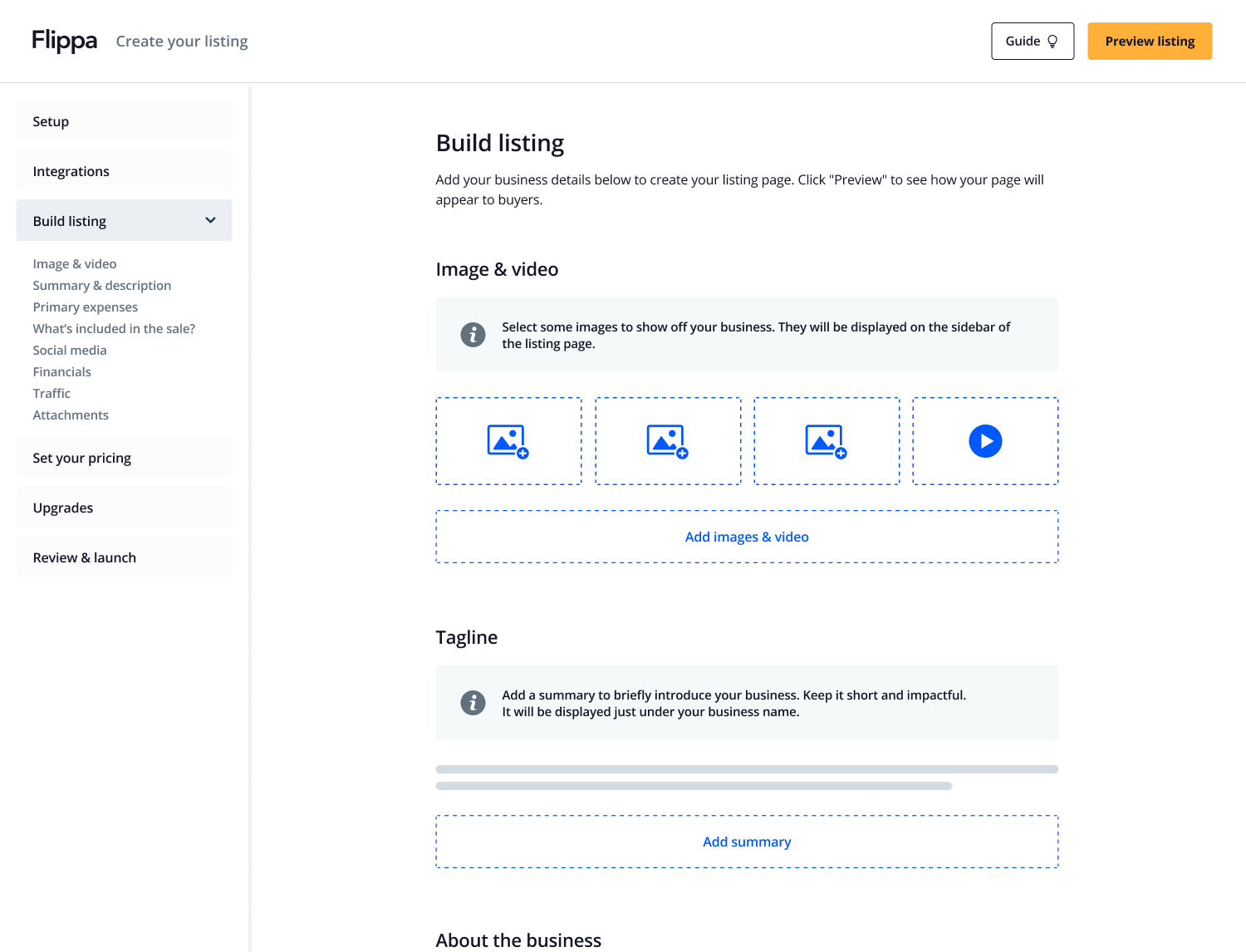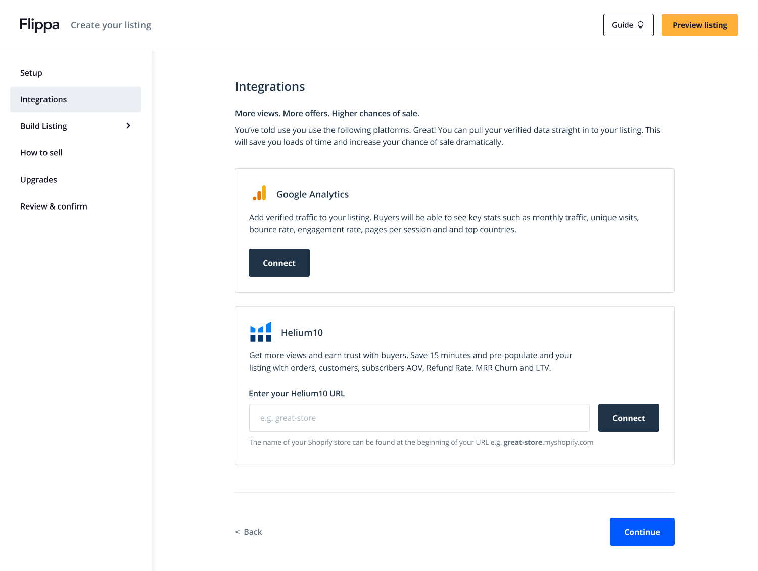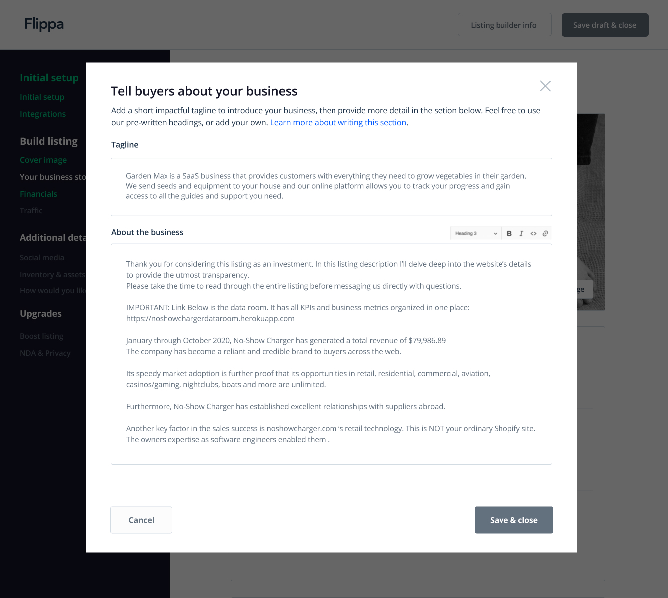 The Listing Builder is a freeform editor which allows sellers to create and launch a listing on Flippa exactly how buyers will see it. Sellers import verified data from any platform they use (e.g. Stripe, Shopify), then populate an empty listing page with their business information such as financials, traffic, social media accounts, platform data and more. Sellers then set parameters such as pricing and auction settings before launching their listing on the marketplace.