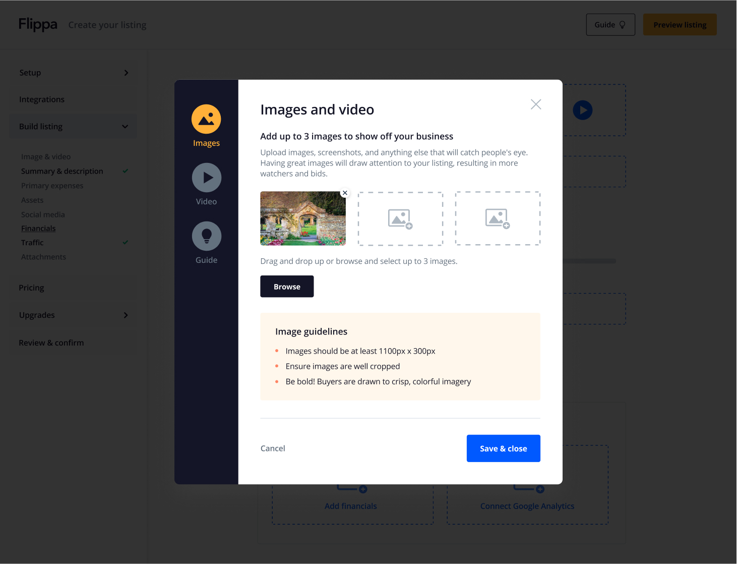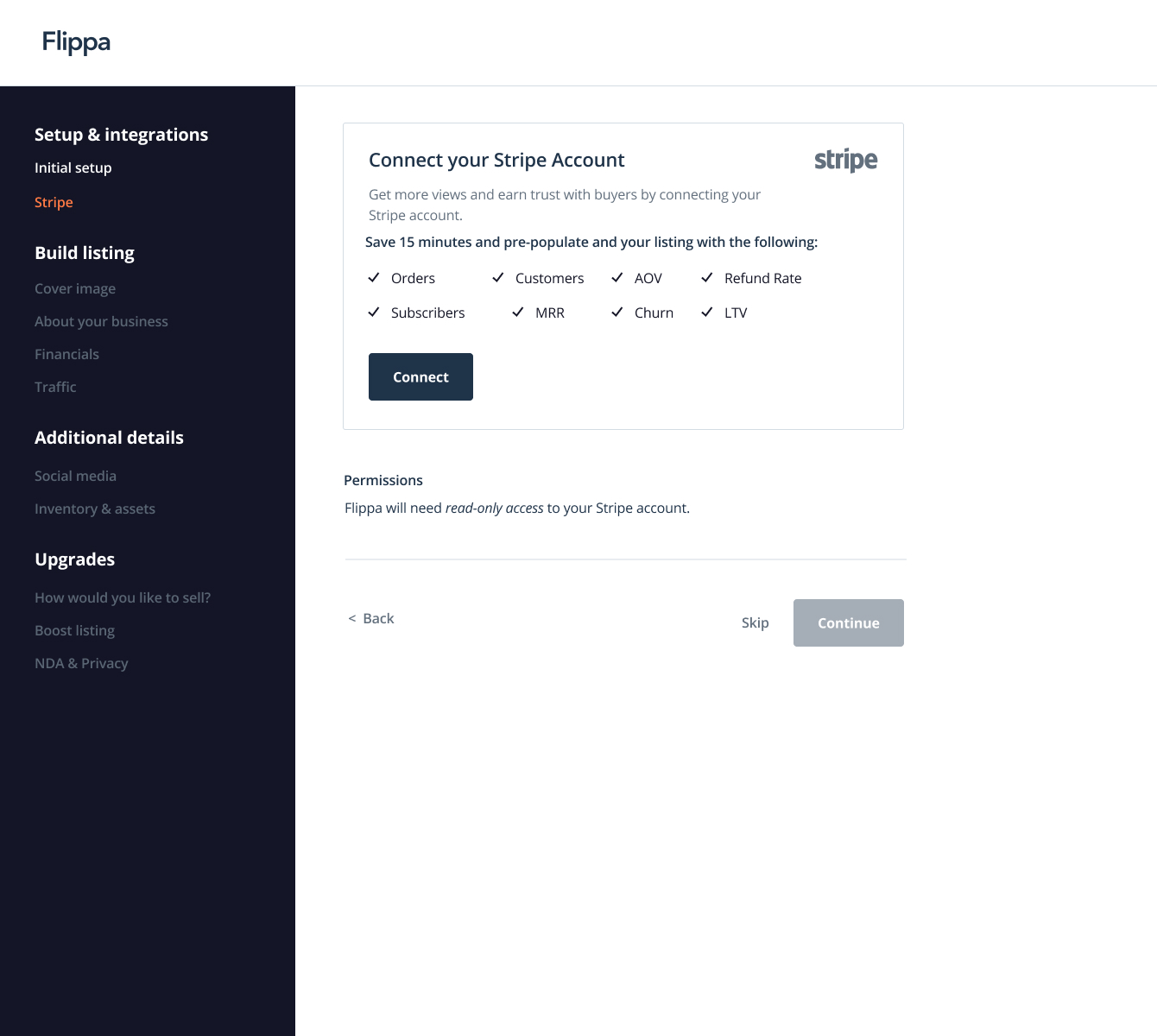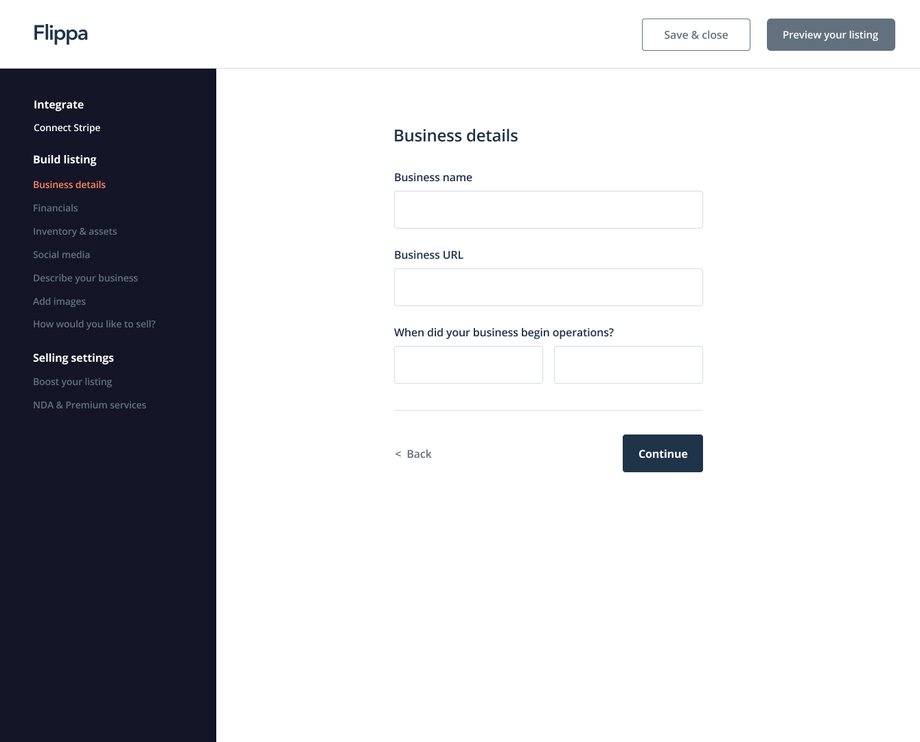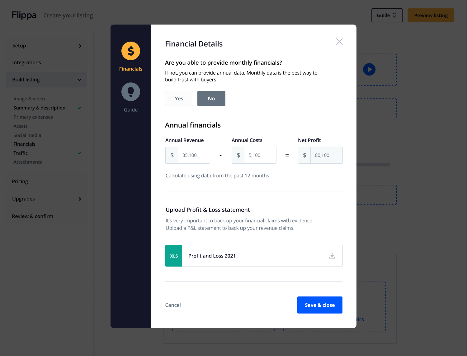 The Listing Builder is a freeform editor which allows sellers to create and launch a listing on Flippa exactly how buyers will see it. Sellers import verified data from any platform they use (e.g. Stripe, Shopify), then populate an empty listing page with their business information such as financials, traffic, social media accounts, platform data and more. Sellers then set parameters such as pricing and auction settings before launching their listing on the marketplace.