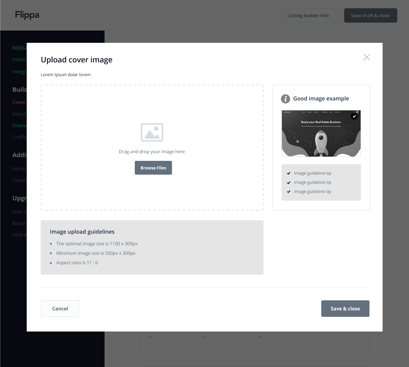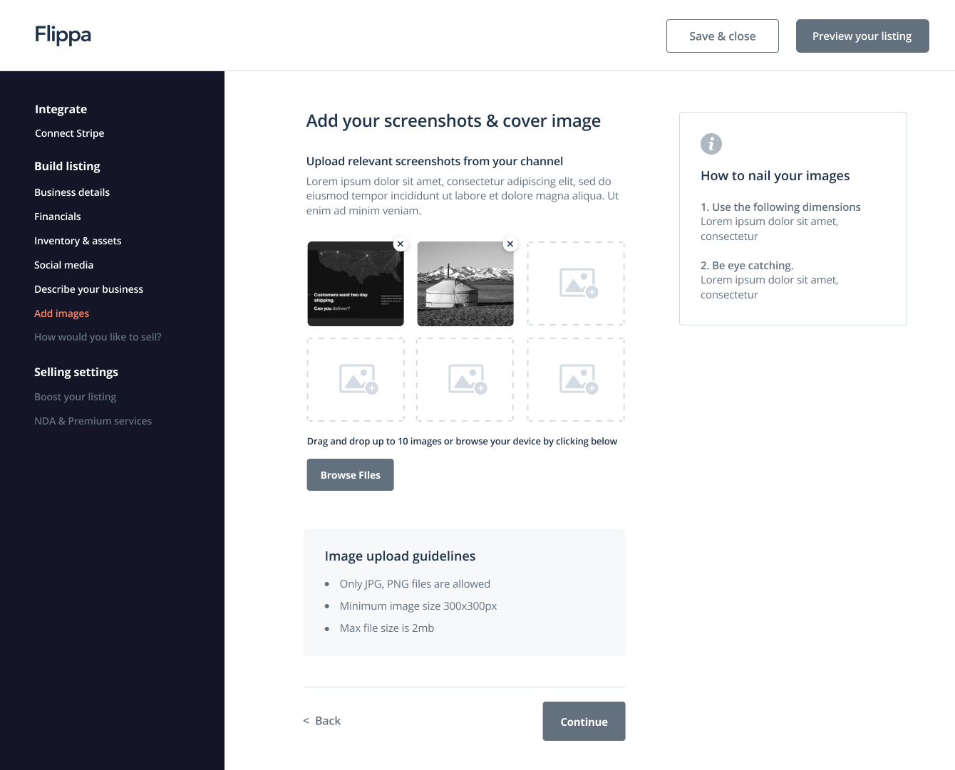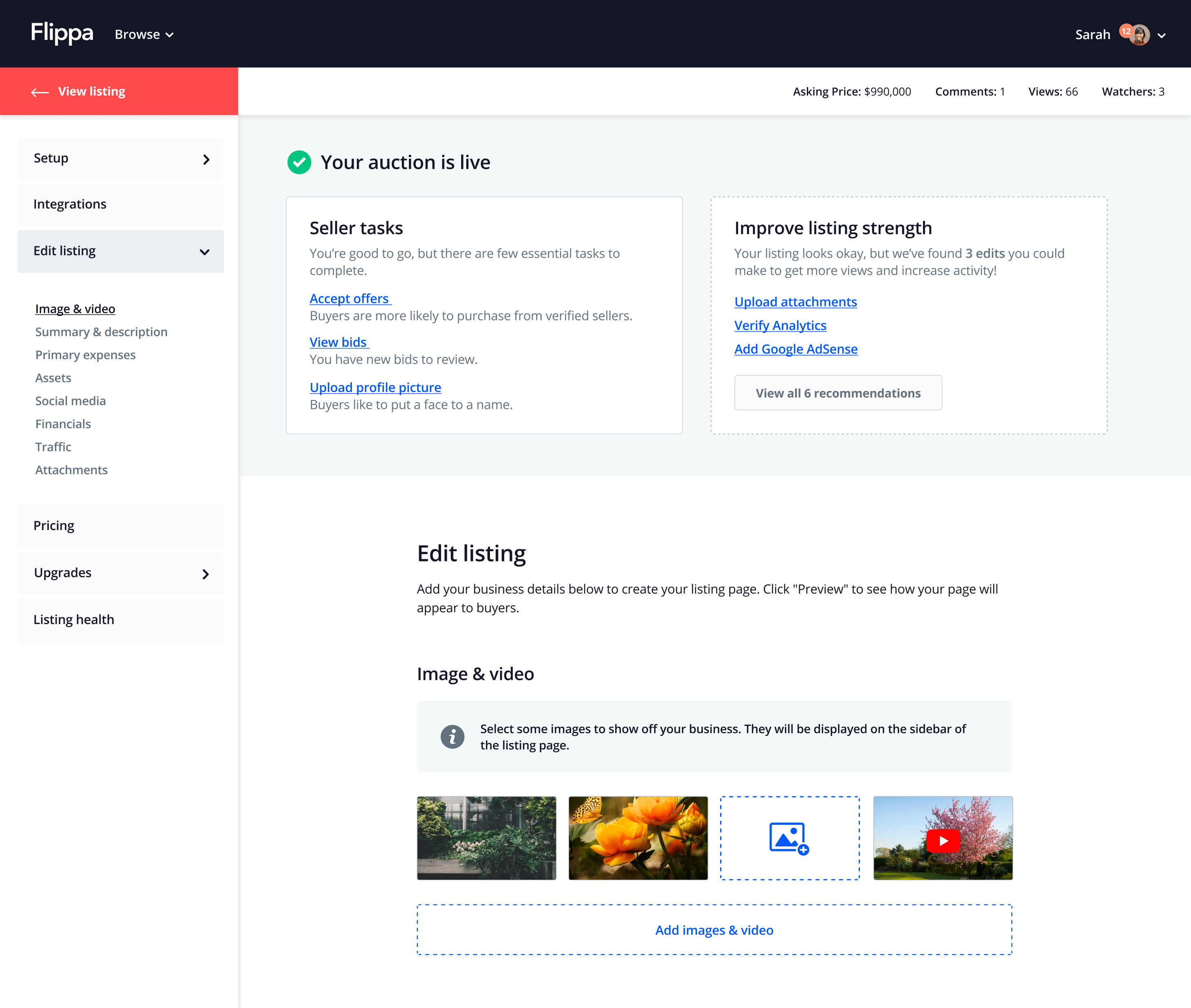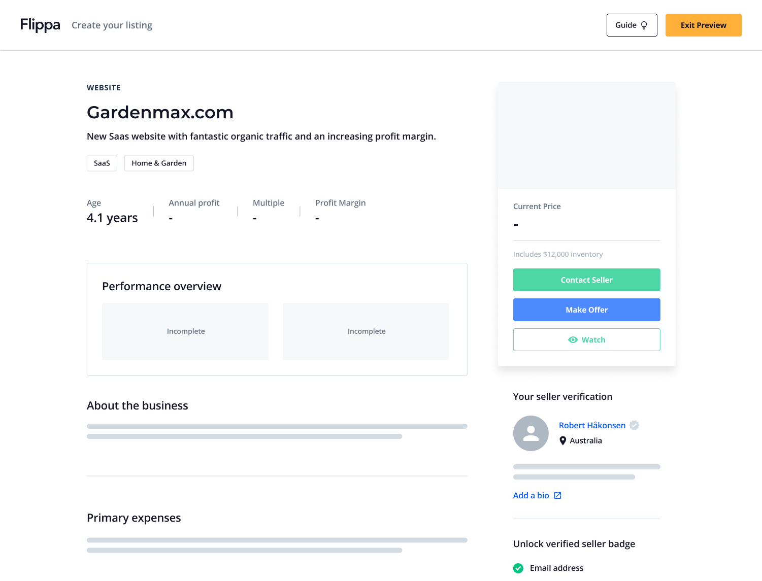 Since its inception 10 years ago, Flippa has been the number one place to list online businesses for sale and has seen great success, boasting 1.6 million registered users. While the business has been going steady, growth is now a key objective for Flippa, and for this to happen, the number of listings launched on the platform must greatly increase. To achieve this outcome, we created a new 'create listing' user flow (AKA the Listing Builder) and a contemporary new listing page, replacing the currently outdated version. The objectives for the project were as follows: