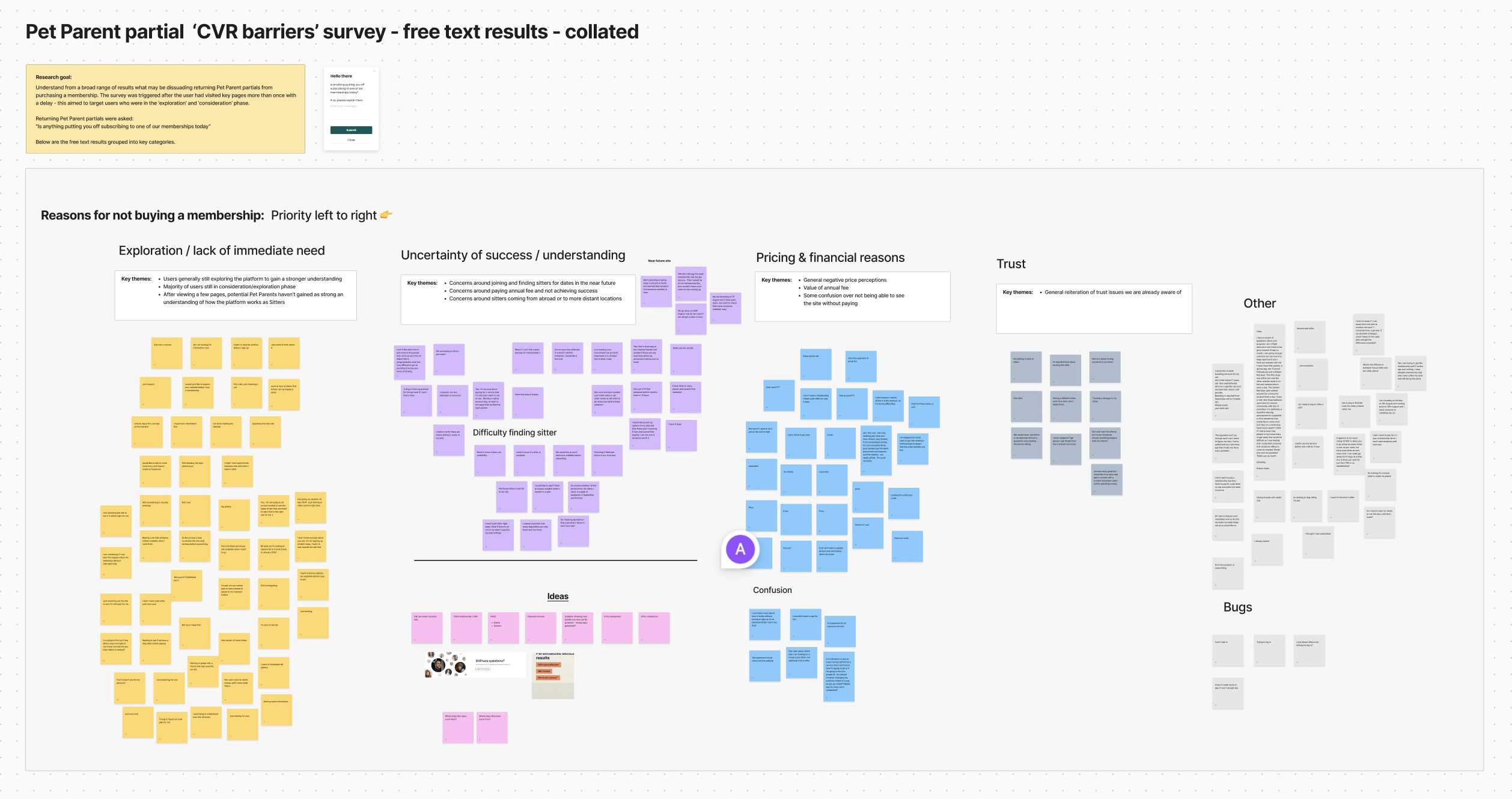 The survey was free text and asked users “Is anything putting you off buying a membership today?”. The results were then imported into Figma where I completed an Affinity Mapping process to bucket the responses into key groups, which can be viewed below. The main reasons discovered putting users off buying a membership were:
