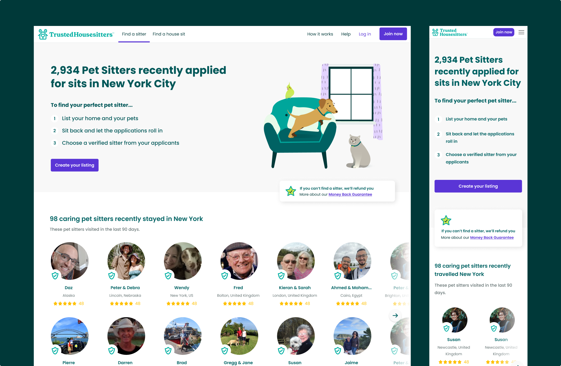 The redesigned page focuses on showing how many sitters applied for sits in the users home town rather than how many sitters are from their home town. We hypothesised that by showing users how popular their location is, their concerns about finding a sitter would be alleviated and they could buy a membership.