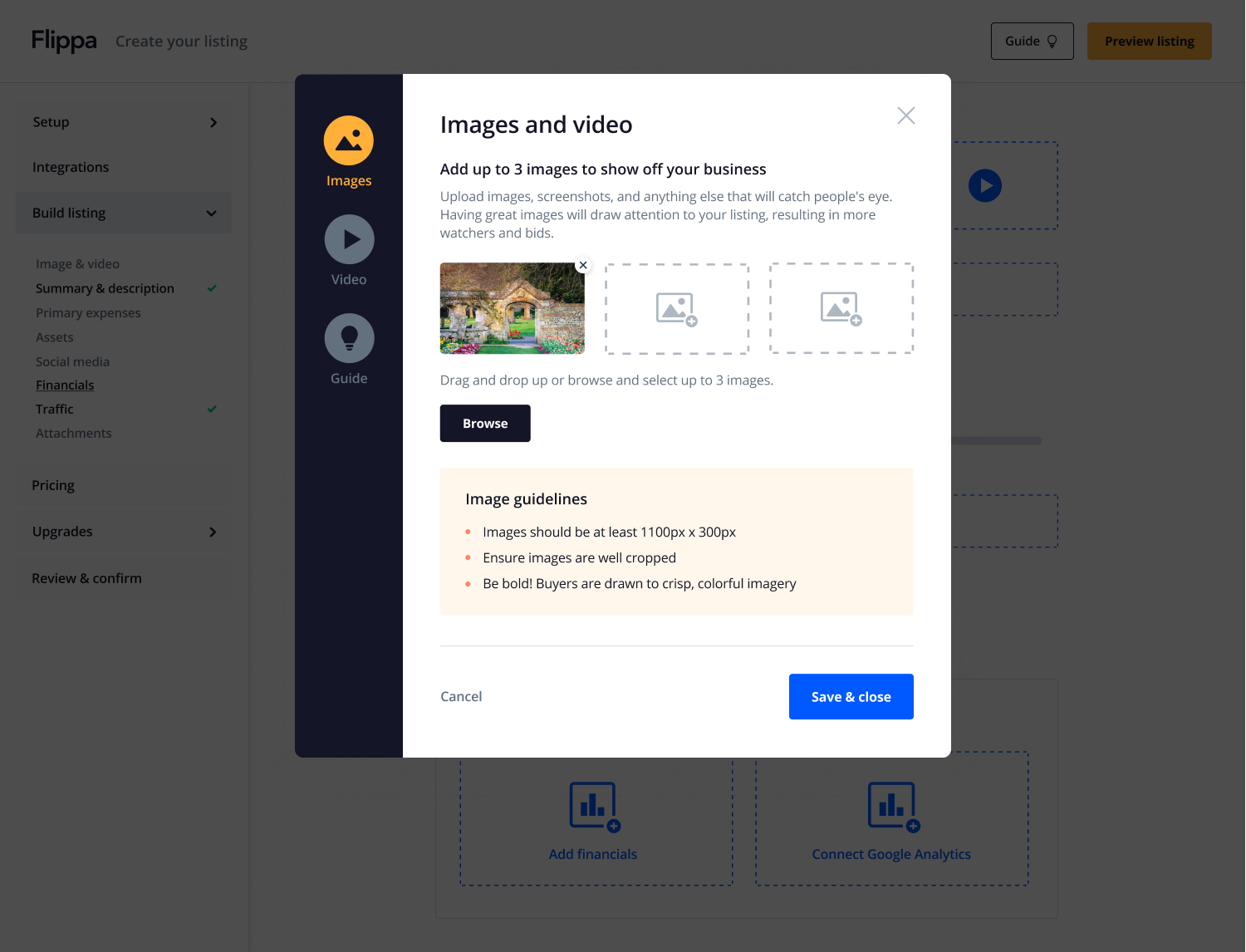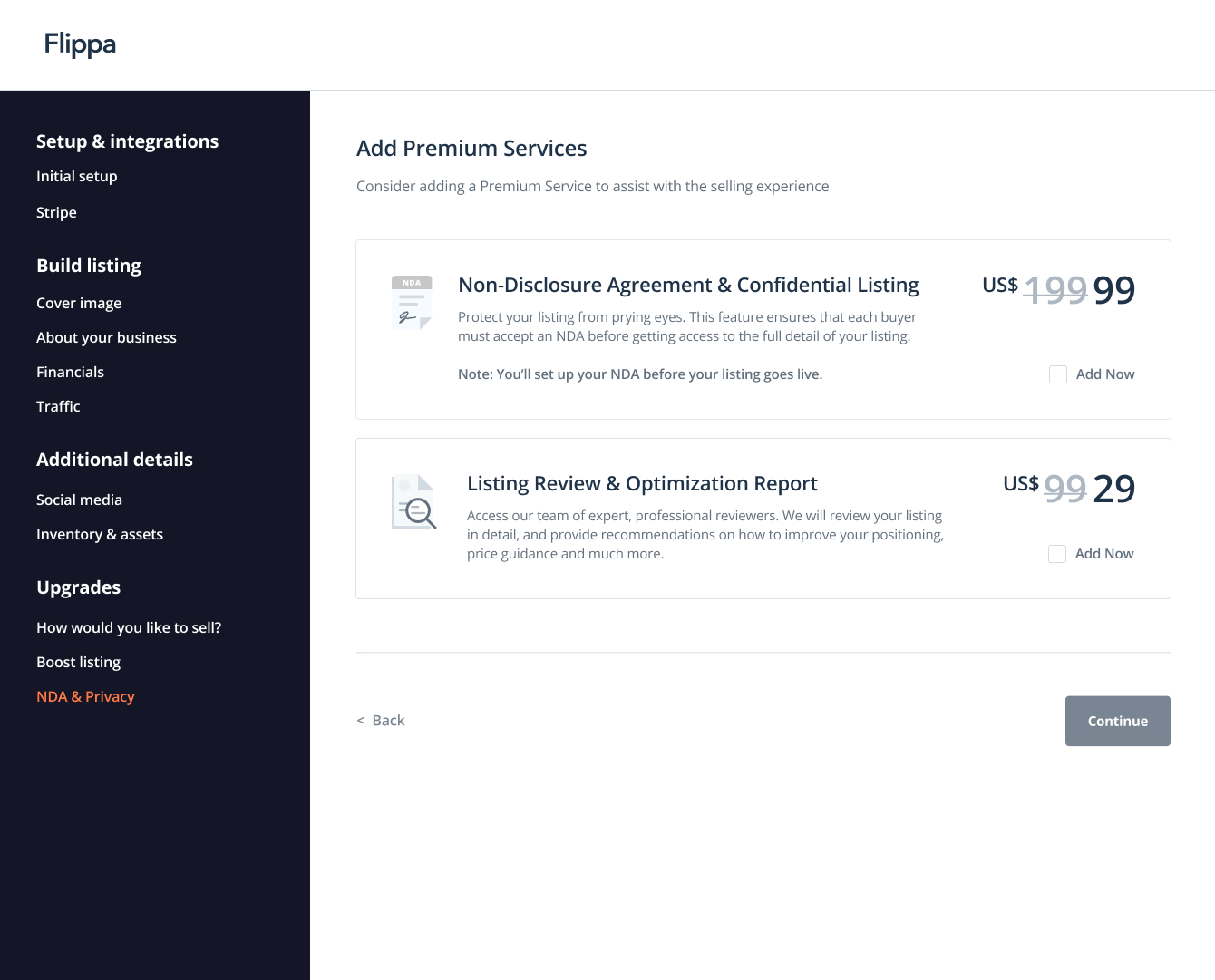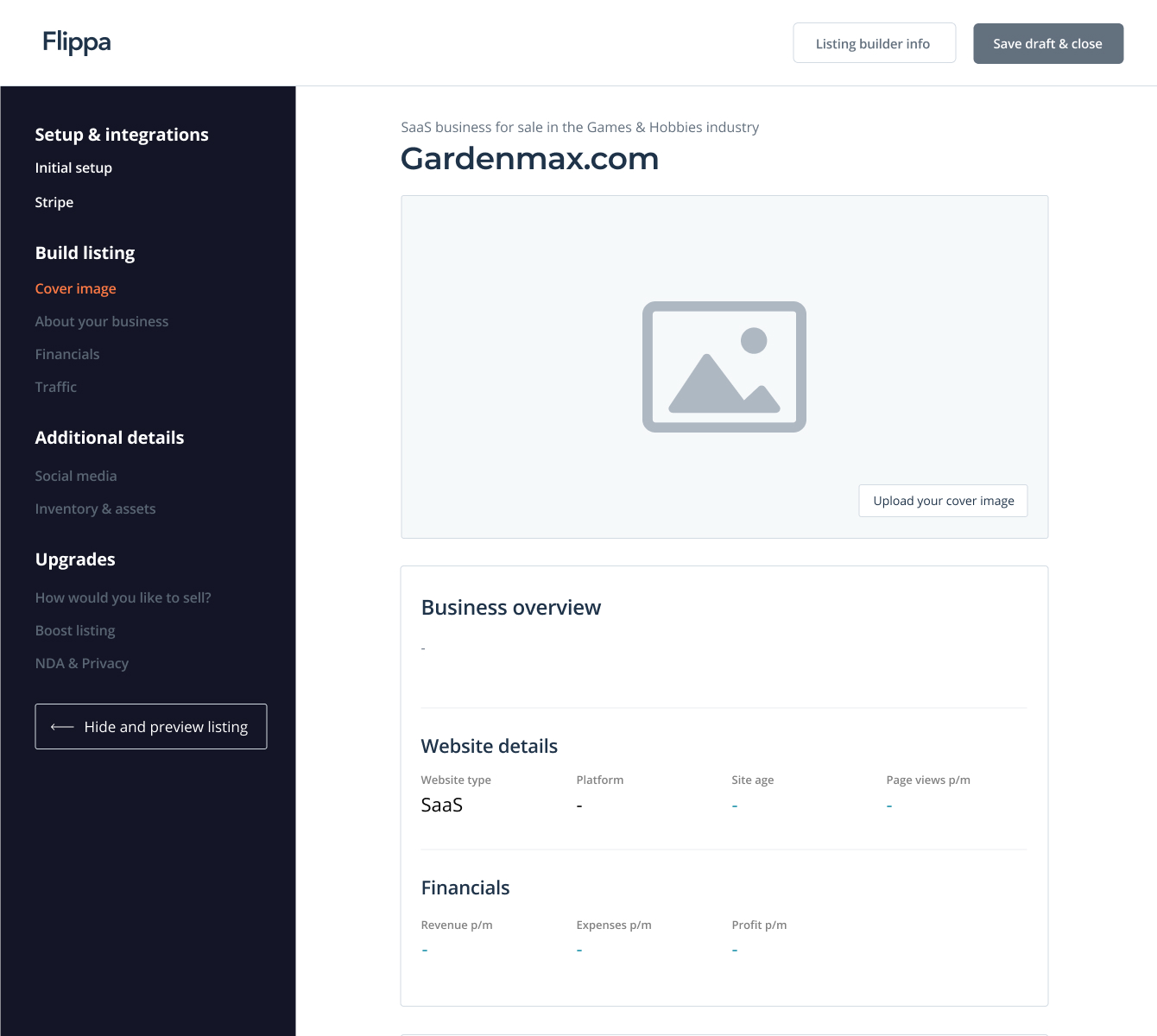The Listing Builder is a freeform editor which allows sellers to create and launch a listing on Flippa exactly how buyers will see it. Sellers import verified data from any platform they use (e.g. Stripe, Shopify), then populate an empty listing page with their business information such as financials, traffic, social media accounts, platform data and more. Sellers then set parameters such as pricing and auction settings before launching their listing on the marketplace.