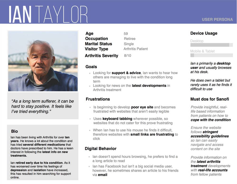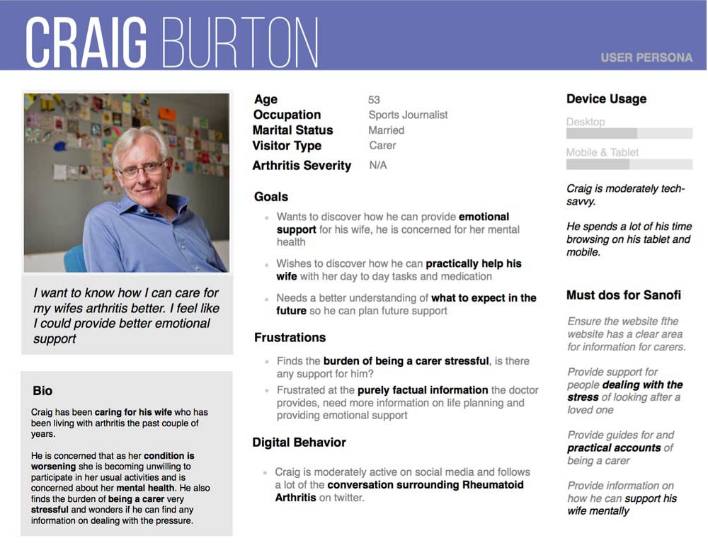 Building from initial user demographic research from the marketing team I created a set of personas. The personas outline arthritis sufferer's goals and frustrations and aim to discover how Sanofi can provide a meaningful experience that caters to their specific needs. The personas feature two users with varying levels of arthritis, as well as a secondary persona to help outline how we can help carers of arthritis.
